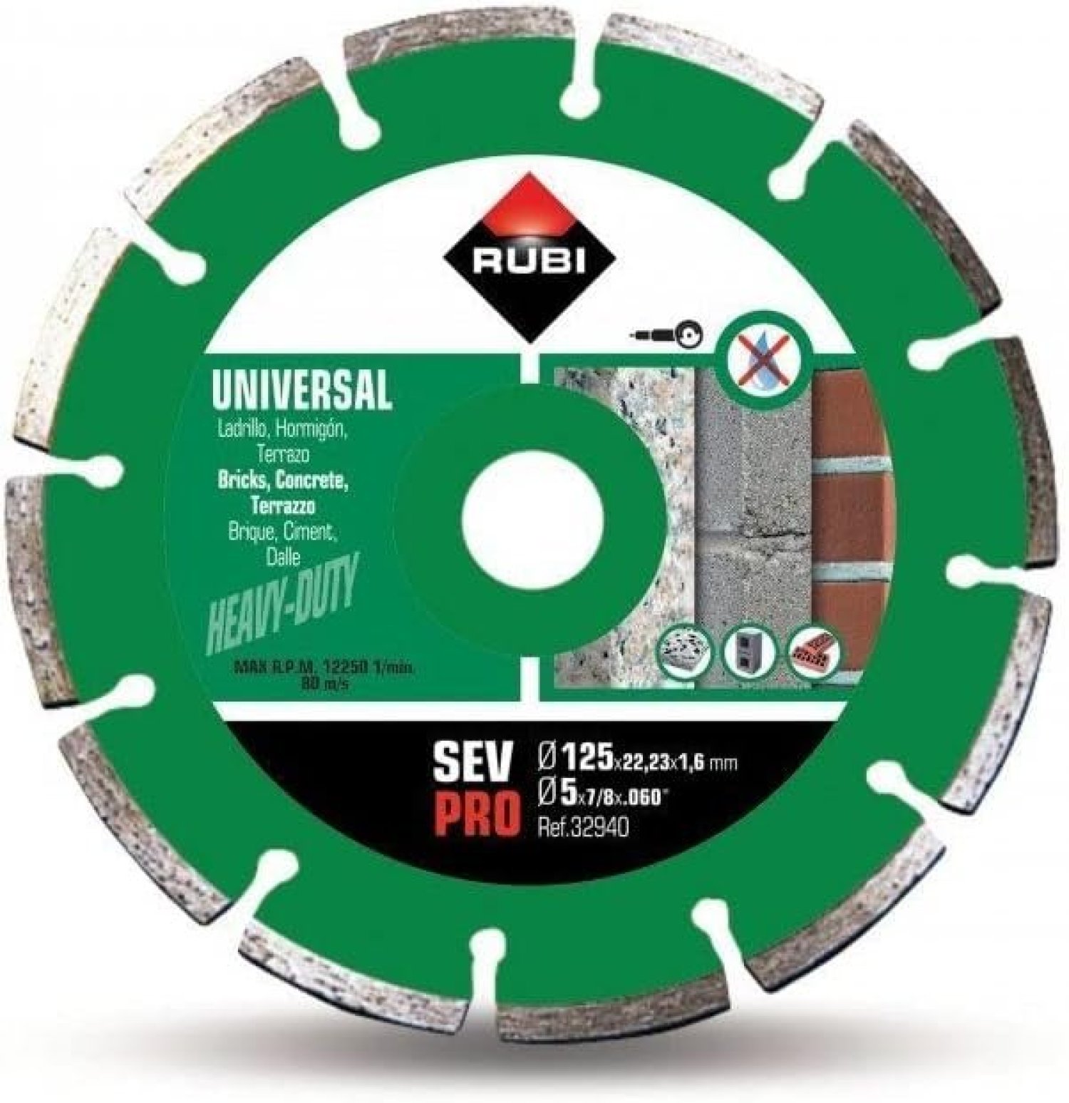 - El disco de diamante SEV de RUBI es un disco recomendado para el corte, en seco, de materiales generales de obra tales como: ladrillo, hormigón, terrazo, etc. Al tratarse de un disco segmentado, el disco de diamante SEV ofrece, al profesional de la construcción, la mayor velocidad de corte.
