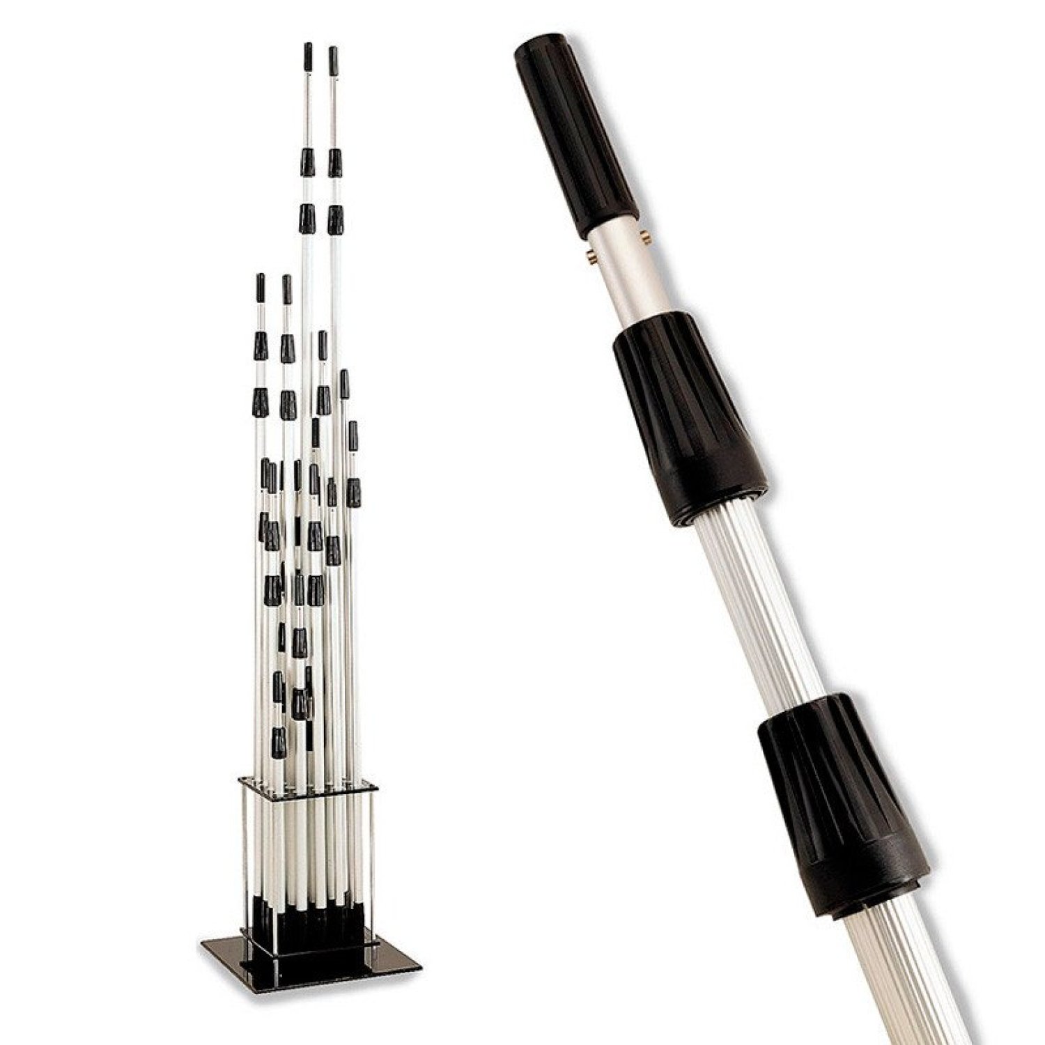 - Permiten incorporar un codo para poder limpiar los cristales en altura de difícil acceso. Pueden acoplar una amplia gama de utensilios de limpieza. El sistema Tele-Plus permite encajar hasta 5 tubos insertados, ofreciendo una excelente versatilidad en su uso.