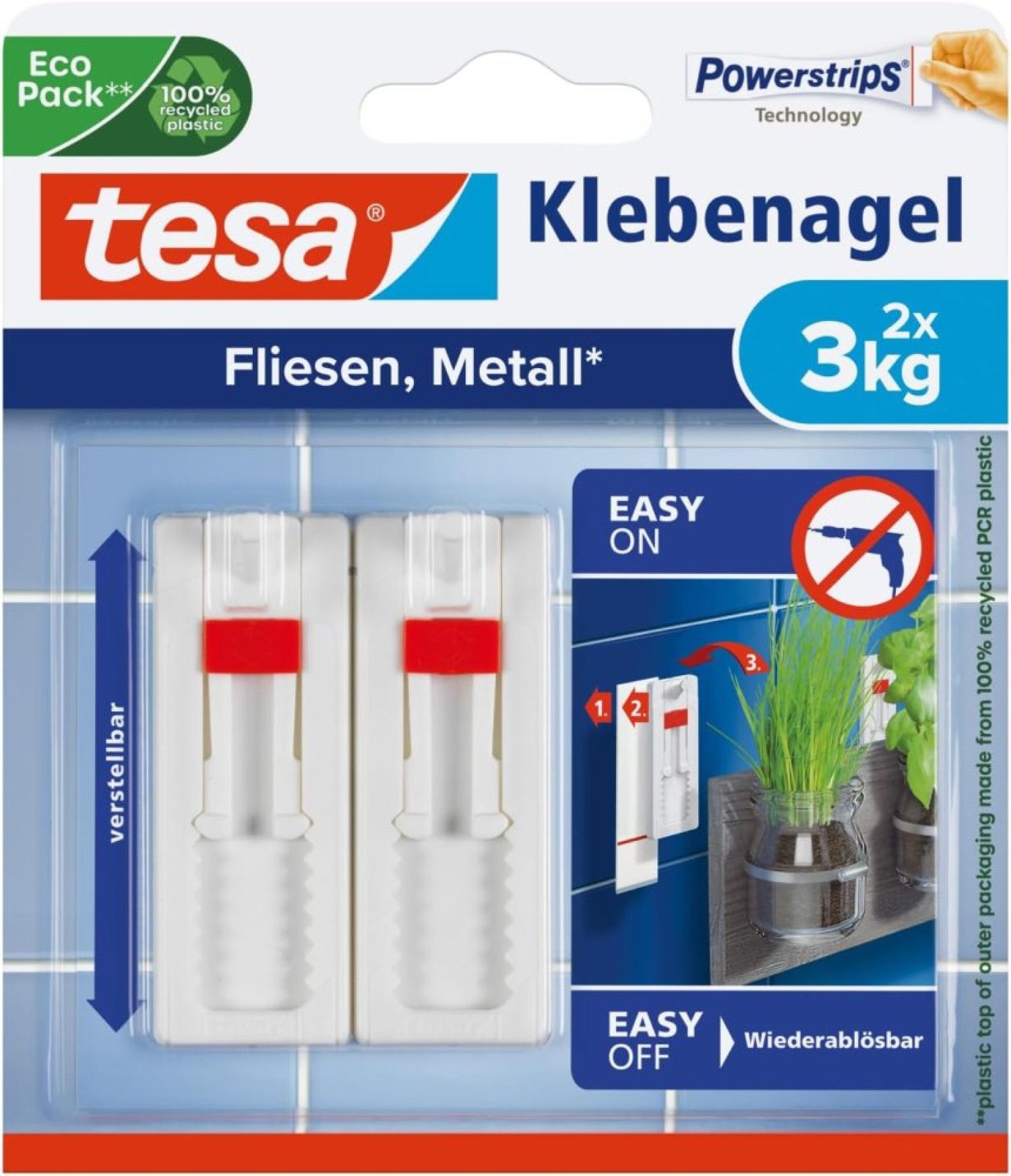 - El clavo adhesivo ajustable tesa® para azulejos y metal y las correspondientes tiras adhesivas, incluidas, sostienen hasta 3 kg por soporte.